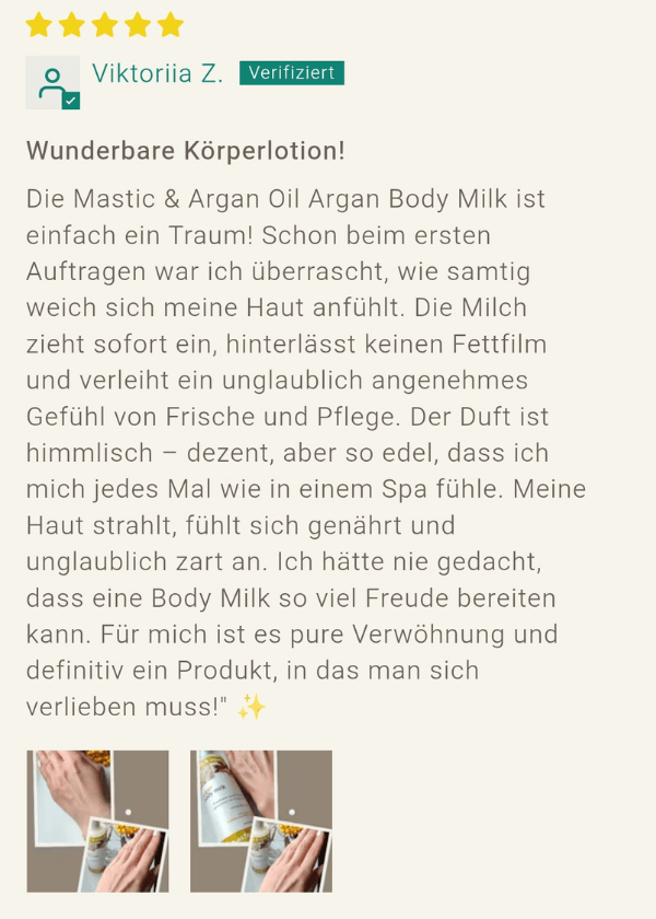 Die Mastic & Argan Oil Argan Body Milk ist einfach ein Traum! Schon beim ersten Auftragen war ich überrascht, wie samtig weich sich meine Haut anfühlt. Die Milch zieht sofort ein, hinterlässt keinen Fettfilm und verleiht ein unglaublich angenehmes Gefühl von Frische und Pflege. Der Duft ist himmlisch – dezent, aber so edel, dass ich mich jedes Mal wie in einem Spa fühle. Meine Haut strahlt, fühlt sich genährt und unglaublich zart an. Ich hätte nie gedacht, dass eine Body Milk so viel Freude bereiten kann. Für mich ist es pure Verwöhnung und definitiv ein Produkt, in das man sich verlieben muss!" ✨