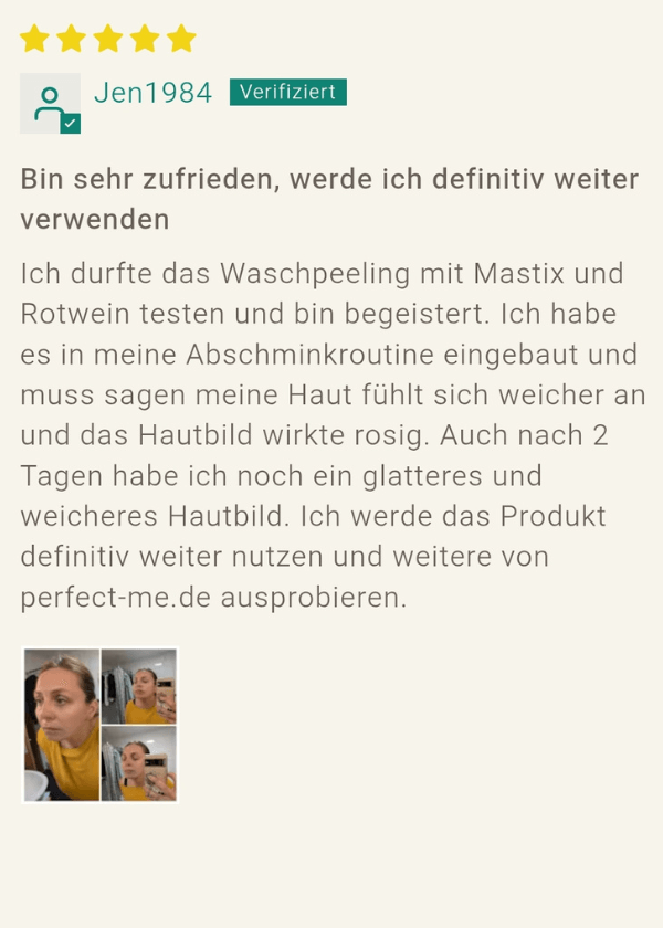 Ich durfte das Waschpeeling mit Mastix und Rotwein testen und bin begeistert. Ich habe es in meine Abschminkroutine eingebaut und muss sagen meine Haut fühlt sich weicher an und das Hautbild wirkte rosig. Auch nach 2 Tagen habe ich noch ein glatteres und weicheres Hautbild. Ich werde das Produkt definitiv weiter nutzen und weitere von perfect-me.de ausprobieren.