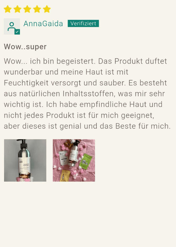 Wow... ich bin begeistert. Das Produkt duftet wunderbar und meine Haut ist mit Feuchtigkeit versorgt und sauber. Es besteht aus natürlichen Inhaltsstoffen, was mir sehr wichtig ist. Ich habe empfindliche Haut und nicht jedes Produkt ist für mich geeignet, aber dieses ist genial und das Beste für mich.