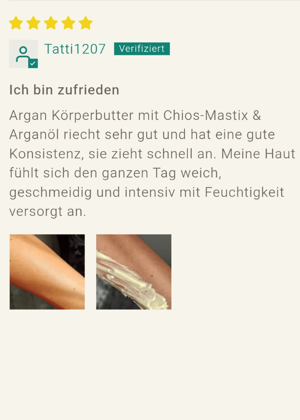 Argan Körperbutter mit Chios-Mastix & Arganöl riecht sehr gut und hat eine gute Konsistenz, sie zieht schnell an. Meine Haut fühlt sich den ganzen Tag weich, geschmeidig und intensiv mit Feuchtigkeit versorgt an.